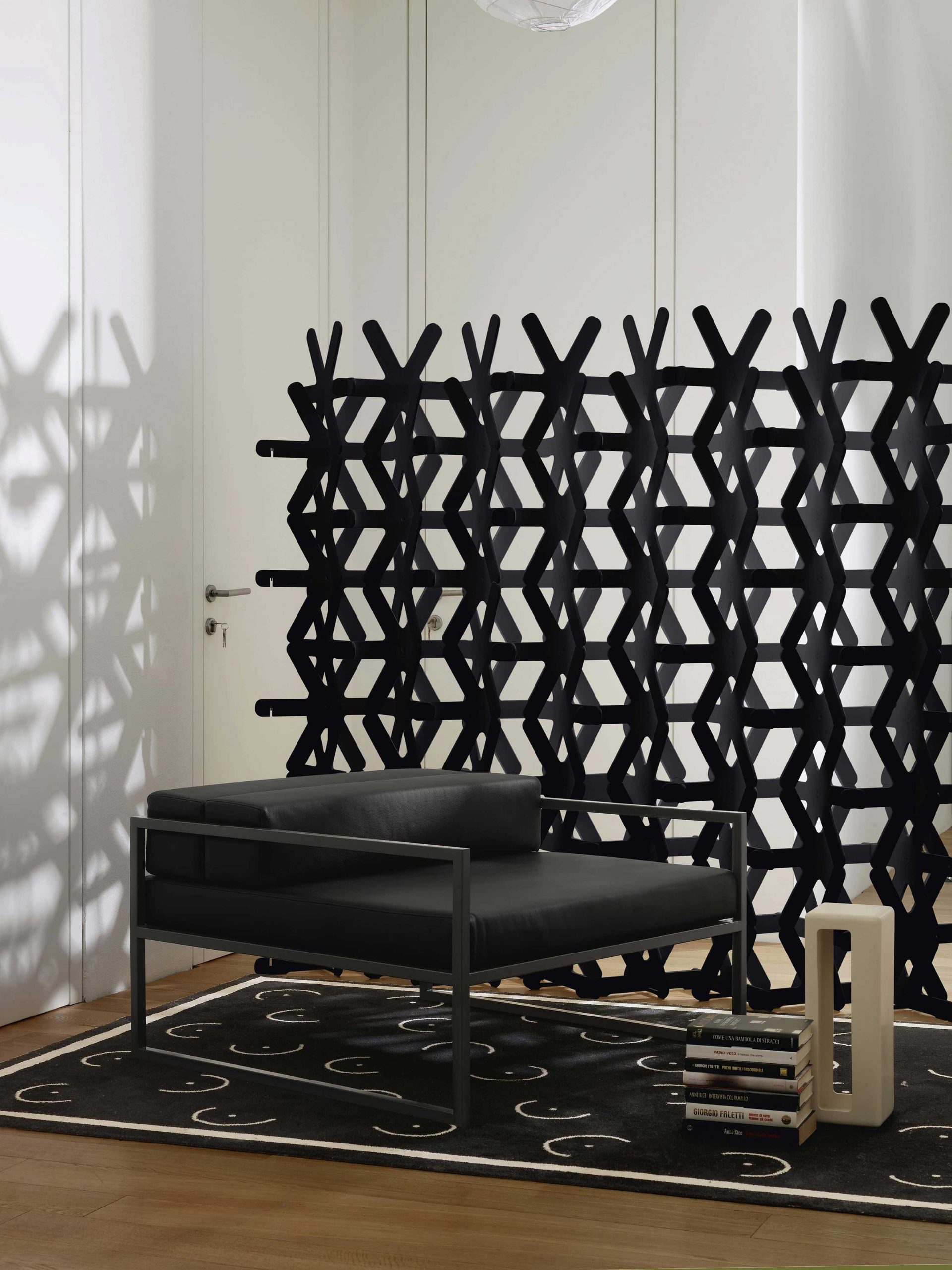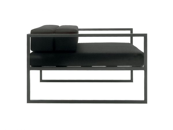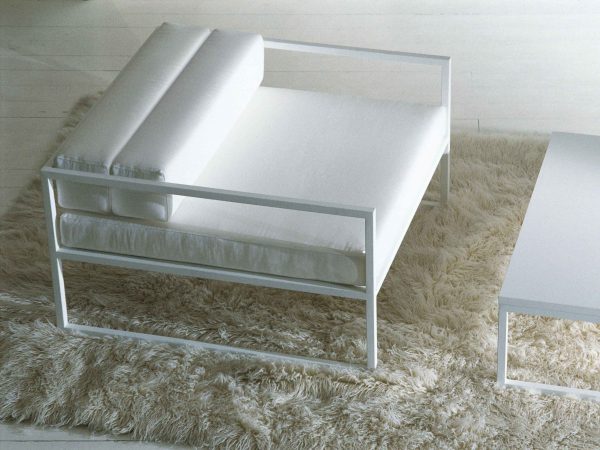 Кресло с металлическим каркасом. Подушки в съемных чехлах из экокожи. Металлическая труба квадратного сечения, полиуретановая пена. Пружинная система, черные резиновые наконечники на ножках.